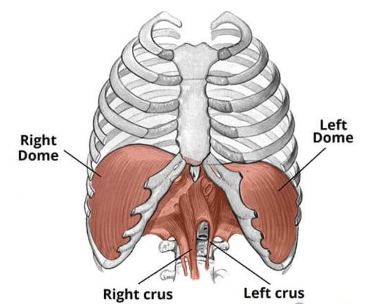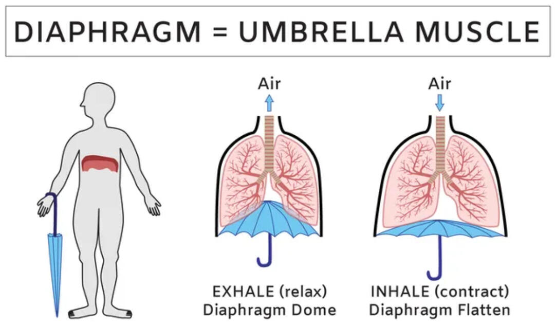 To understand why this position is most efficient for breathing, we first need to understand basic breathing mechanics. The primary breathing muscle is called the diaphragm - a dome shaped “umbrella” muscle that sits directly under the lungs and spans the entire circumference of the rib cage. You can see the right side of the diaphragm is bigger than the left side, which is one of the many contributors to the asymmetry of the human body (but that’s a TOTALLY different article). For the purposes of this article, the right side of the diaphragm can work better during breathing, but the left diaphragm has an easier time moving downward as you breathe in.As you inhale, the diaphragm contracts by flattening (like an umbrella when you open it), allowing for the lungs to move downward in the chest cavity. As you exhale, the diaphragm recoils upward and relaxes by taking on a dome shape, helping you create the necessary pressure to expel the air out of the lungs.