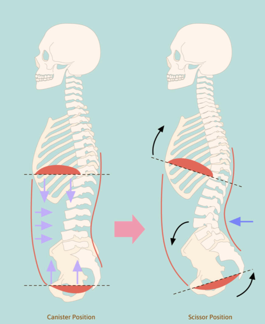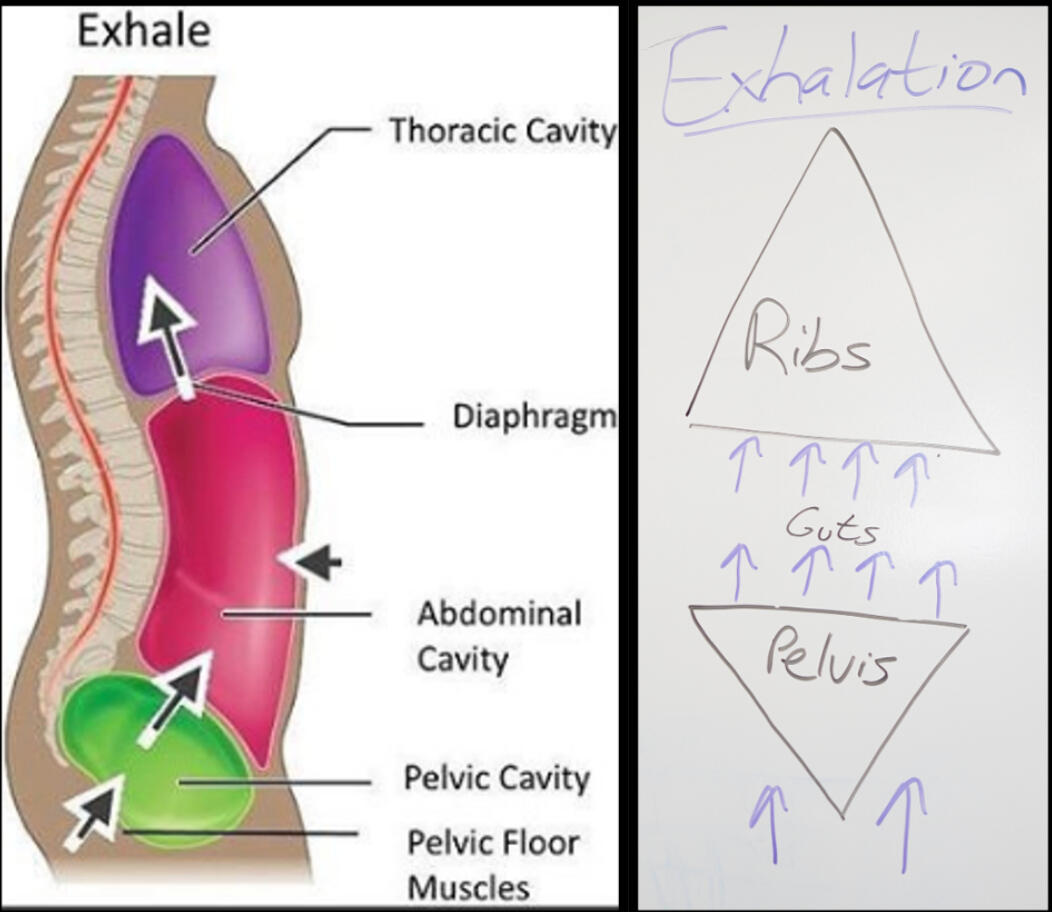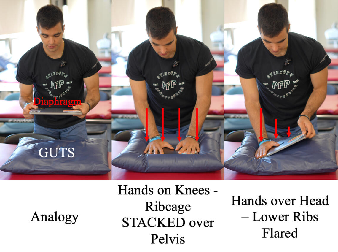Seeing how these two diaphragms move synchronously during breathing, keeping these two diaphragms stacked on top of one another will allow for an efficient pistoning effect, effective breathing mechanics, and the greatest amount of air moved during each breath. Now, let’s take a closer look at the two breathing strategies: hands on knees and hands over head.