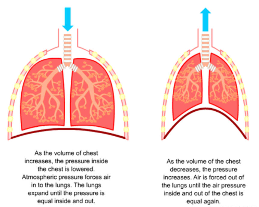 Speaking of pressure, we have to discuss the relationship between pressure and volume to fully understand breathing. This is where that high school physics class finally comes in handy. Boyle's law states that the pressure and volume of a gas have an inverse relationship; in simple terms, if volume increases, then pressure decreases. If volume decreases, pressure increases.When we breathe in, the diaphragm drops, the lungs and chest cavity expand, and volume increases. The pressure of air outside the body is now greater than inside the body, driving air into the lungs. When we exhale, the diaphragm ascends, increasing pressure and decreasing the volume of the lungs and chest cavity; this pressure gradient pushes air out of the body.