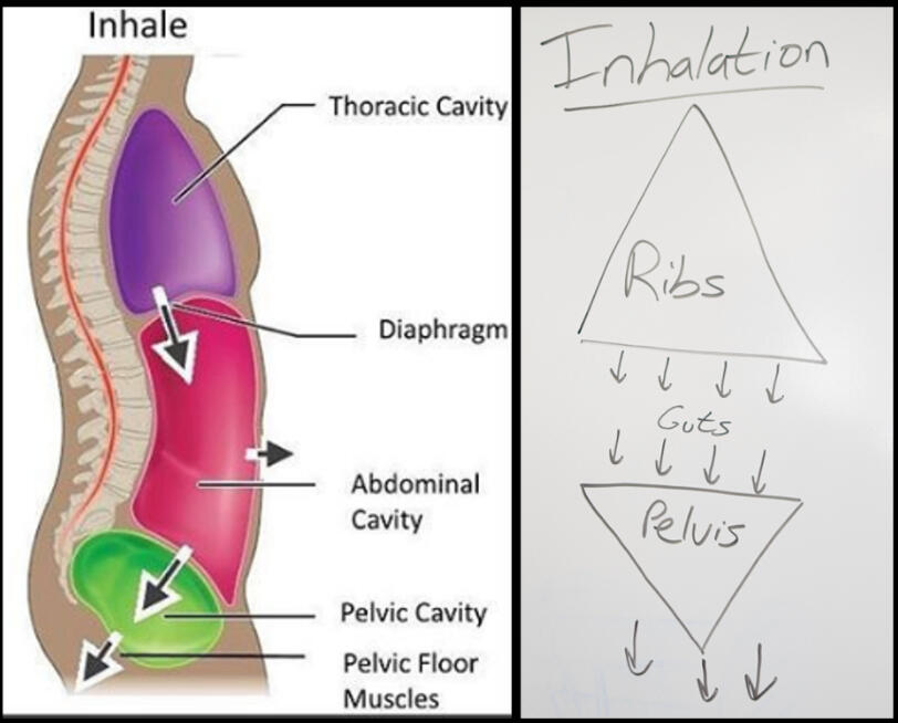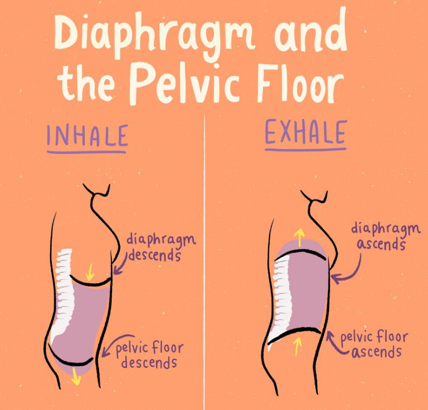 The body does not have just one diaphragm, it has TWO! The common term for the second diaphragm is the pelvic floor; but for the purposes of this article, we will refer to the diaphragms as the thoracic diaphragm and pelvic diaphragm. These two diaphragms move synergistically - as you breathe in, the thoracic diaphragm and pelvic diaphragm descend; as you breathe out, the thoracic diaphragm and pelvic diaphragm ascend.