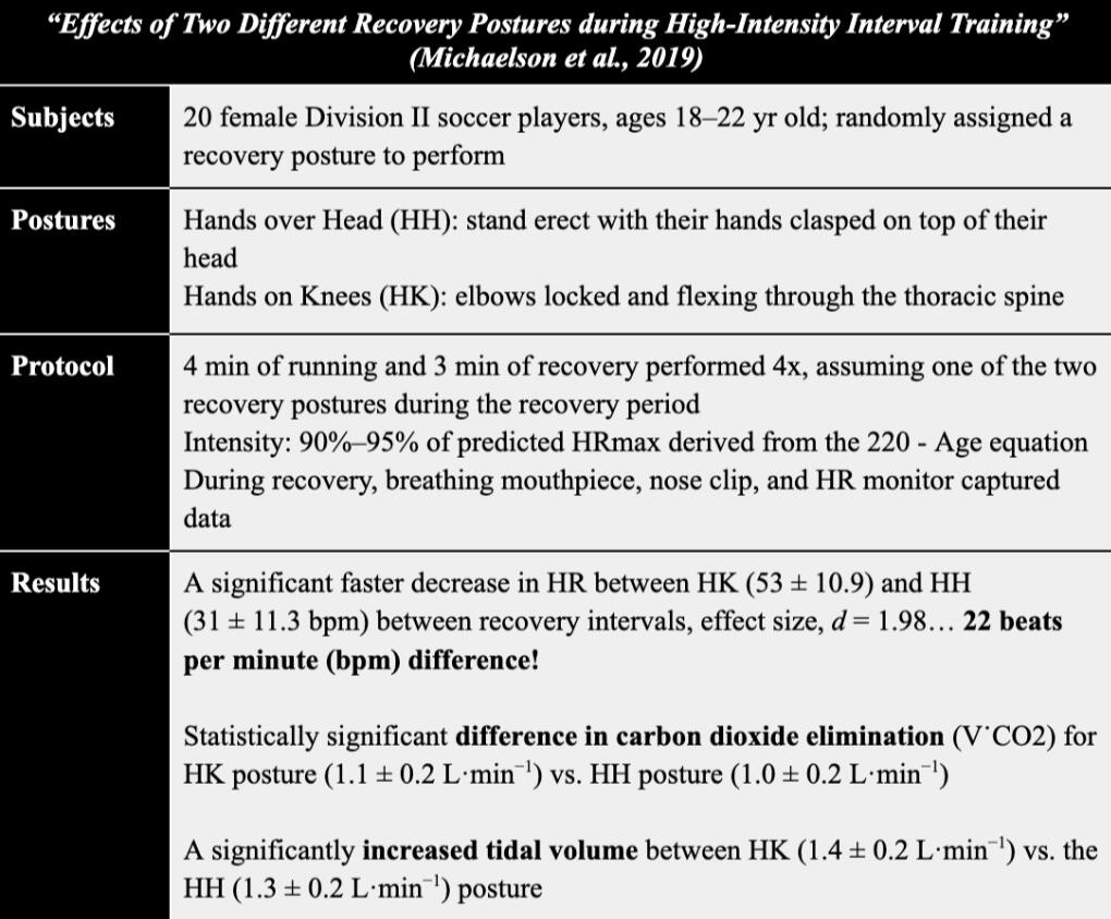 Another study titled, “Effects of Two Different Recovery Postures during High-Intensity Interval Training” by Michaelson et al., 2019 investigated the effects of these two recovery postures - hands over head (HH) and hands on knees (HK) as recovery methods immediately after high-intensity interval training (HIIT). The hands on knees posture led to an improved heart rate (HR) recovery, a higher rate of carbon dioxide (CO2) elimination, and greater air movement into and out of the lungs (called tidal volume) compared to hands over head posture following intense exercise (Michaelson et al., 2019). Check out the table for a succinct summary of the research study!
