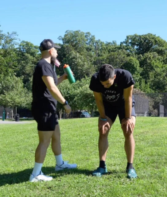A staple of our Doctor of Physical Therapy (DPT) education involves evidence based practice (EBP); in other words, having a research based backing to everything we do. A research article by Boyle et al. 2010 started the conversation by proposing that one can speed up the recovery between exercise bouts by maximizing the surface area of the diaphragmatic zone of apposition (ZOA). The ZOA refers to the space where the diaphragm starts in the ribcage and goes all the way down to the lowest ribs. Optimizing the ZOA surface area allows the diaphragm to operate with maximal efficiency, which occurs during spinal rounding (AKA spinal flexion) rather than spinal arching (aka extension).Raising the arms overhead actually restricts the mechanical efficiency of the thoracic wall and ab muscles. Because of this, a standing posture with hands over head may be less advantageous to postures that increase the ZOA - the hands on knees.